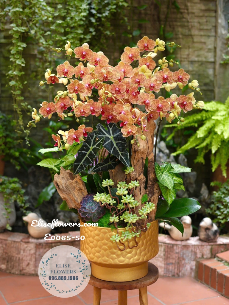 4. Món Quà Ý Nghĩa, Mang Nét Riêng Biệt: Thay vì những món quà truyền thống, một chậu lan hồ điệp độc đáo sẽ tạo ấn tượng mạnh mẽ và khó quên. Đặc biệt, sự kết hợp của lan hồ điệp với các loại cây cảnh nhỏ, gốc lũa nghệ thuật (như trong hình ảnh) càng làm tăng thêm giá trị thẩm mỹ và ý nghĩa của món quà, biến nó thành một tác phẩm nghệ thuật thực sự.