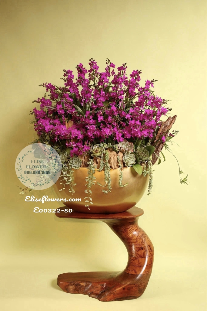 Bố Cục Đỉnh Cao: Hàng trăm cành lan được sắp đặt khéo léo, tạo thành một khối hoa đồ sộ, tràn đầy sức sống, kết hợp hài hòa với những gốc lũa tự nhiên (nếu có trong thiết kế tương tự) và các loại cây lá xanh tươi như sen đá, dương xỉ hay rêu cảnh. Tất cả tạo nên một tổng thể nghệ thuật, đẳng cấp.