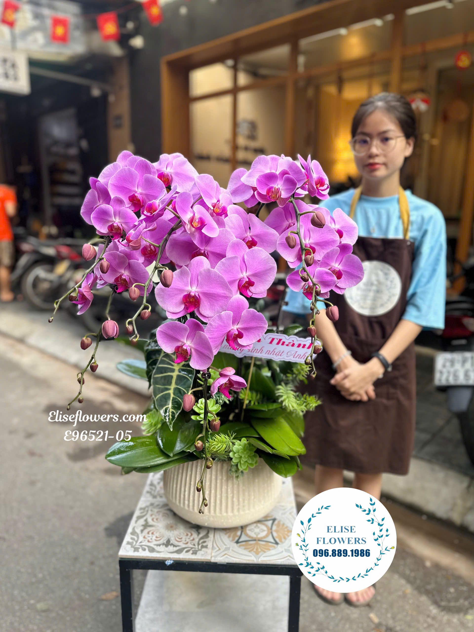Thiết kế độc đáo: Mỗi chậu lan là một tác phẩm được các nghệ nhân cắm hoa của Elise Flowers thiết kế tỉ mỉ, đầy tâm huyết.