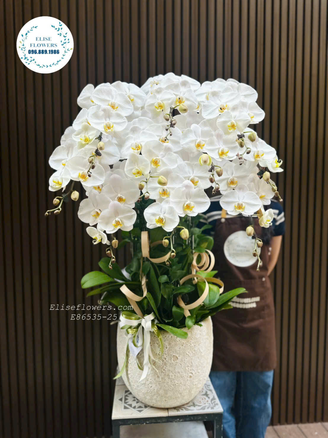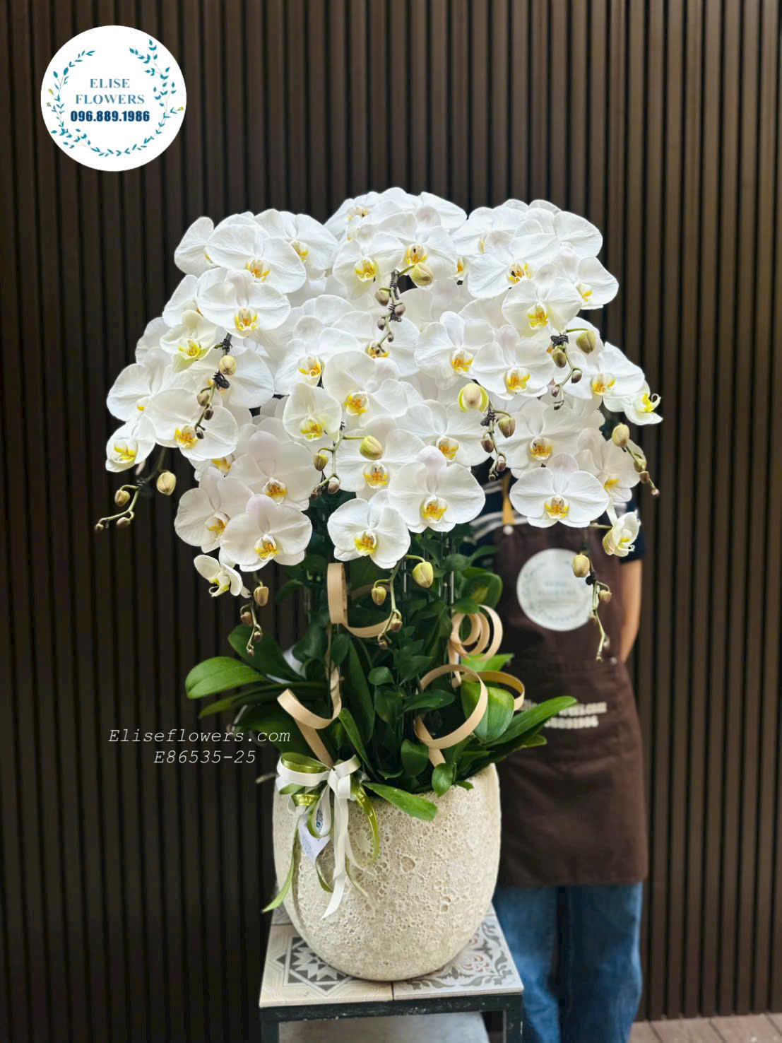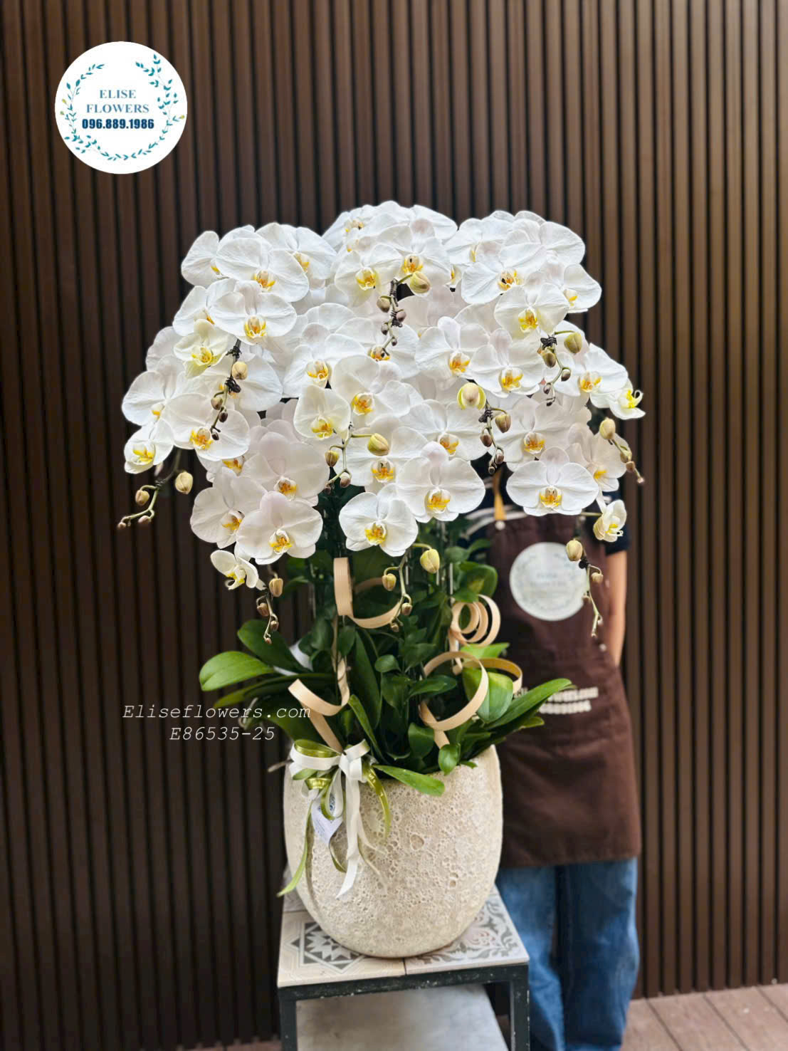Tại Elise Flowers, chúng tôi hiểu rằng mỗi chậu hoa gửi đi là một thông điệp yêu thương. Với kỹ thuật ghép chậu nghệ thuật, những cành lan được tuyển chọn kỹ lưỡng, nở rộ đều đặn, tạo nên một tác phẩm nghệ thuật làm bừng sáng không gian sống của ông.