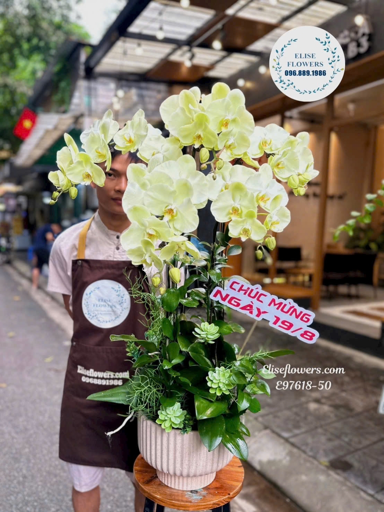 Thiết Kế Tinh Tế – Đẳng Cấp Vượt Trội: Mỗi cành lan được nghệ nhân của Elise Flowers cắm tỉ mỉ, kết hợp hài hòa cùng các loại cây lá xanh tươi, tạo nên một tổng thể cân đối, đẹp mắt từ mọi góc nhìn. Chậu cây được chọn lựa kỹ càng, không chỉ bền mà còn tôn thêm vẻ sang trọng cho món quà.
