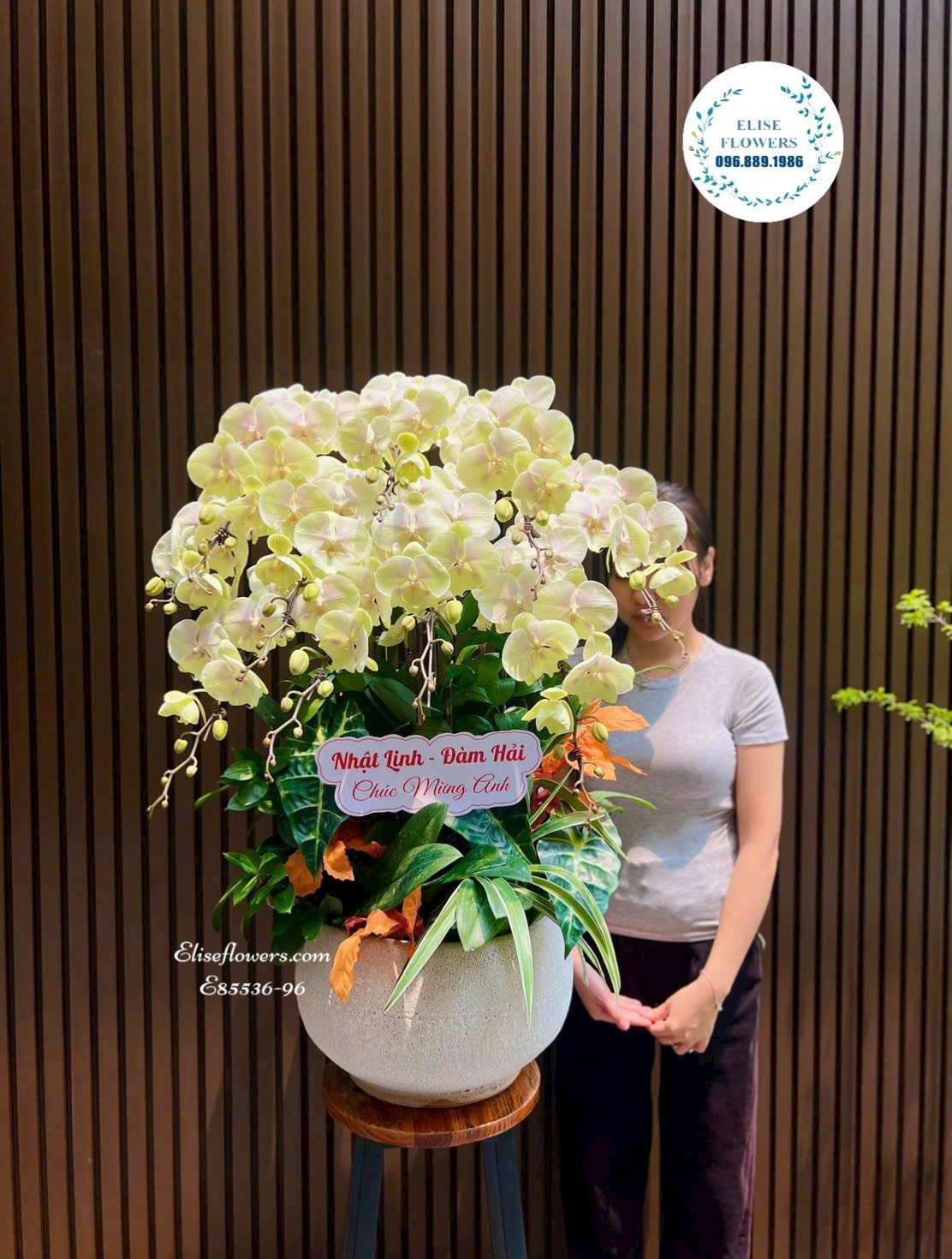 Thiết kế: Tại Elise Flowers, chúng tôi kết hợp những cành lan hồ điệp Đà Lạt loại A (cánh dày, bông to, đều tắp) cùng chậu sứ trắng cao cấp và các loại lá phụ xanh mướt, tạo nên tổng thể hài hòa, sang trọng.